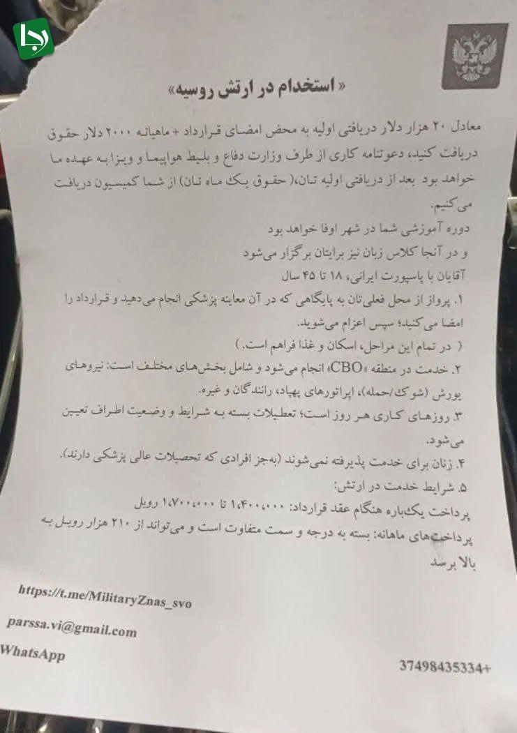 The denial followed a report by the Tehran-based outlet Rouydad24, which said that leaflets distributed near the Russian Embassy in Tehran invited Iranian men to join the Russian army with promises of dollar payments and contracts “directly under the Ministry of Defense of the Russian Federation.”